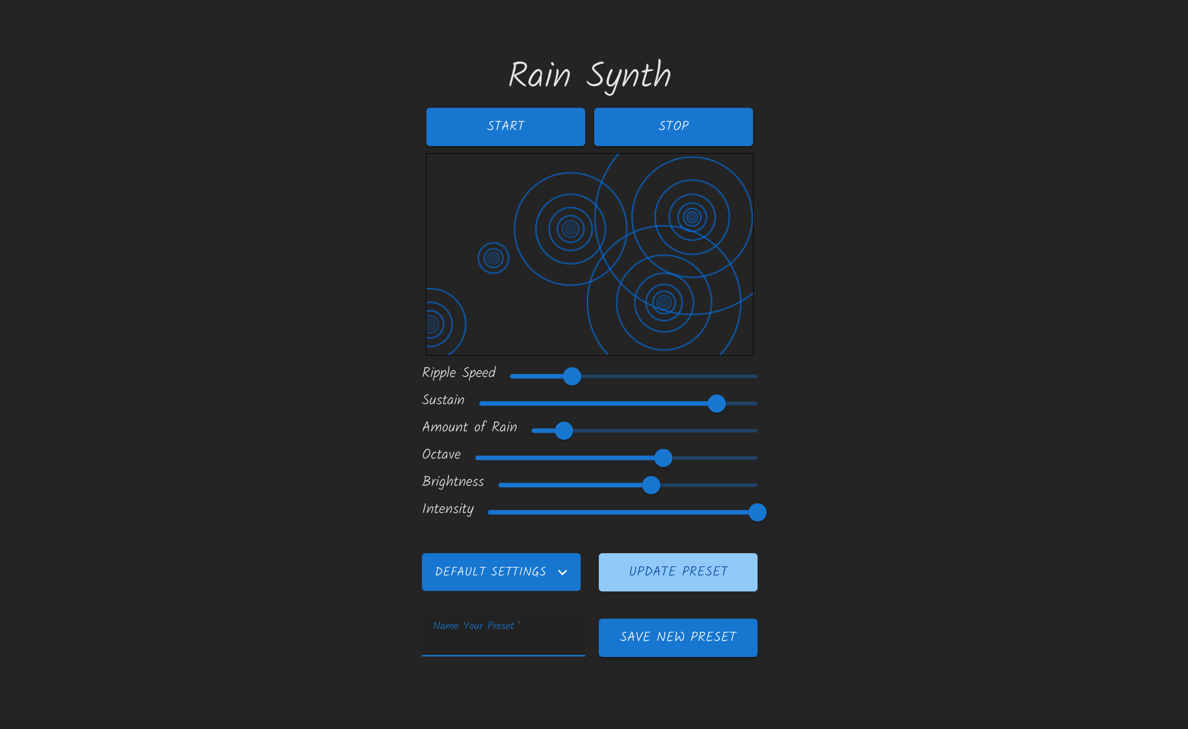 Then it was time to connect the visualizer to the sound engine. Each time a circle is drawn, a note is triggered. I removed some controls so that the notes would always sound good - I wanted them to be in the key of A major, to use a sawtooth wave, and each note has a very slight randomized amount of detune on it to create a chorus effect. The filter has been locked to a lowpass. The rest of the process was making connections - deciding how visual changes should affect the audio and vice versa. To make mapping these controls to multiple destinations easier, I made a simple function that could be used across the application. For example, It allows me to easily do things like invert the "Amount of Rain" slider so that its minimum value is actually setting a large number of milliseconds on a setInterval function. Or scale the width of the canvas to match the length of the arrays of possible note values.